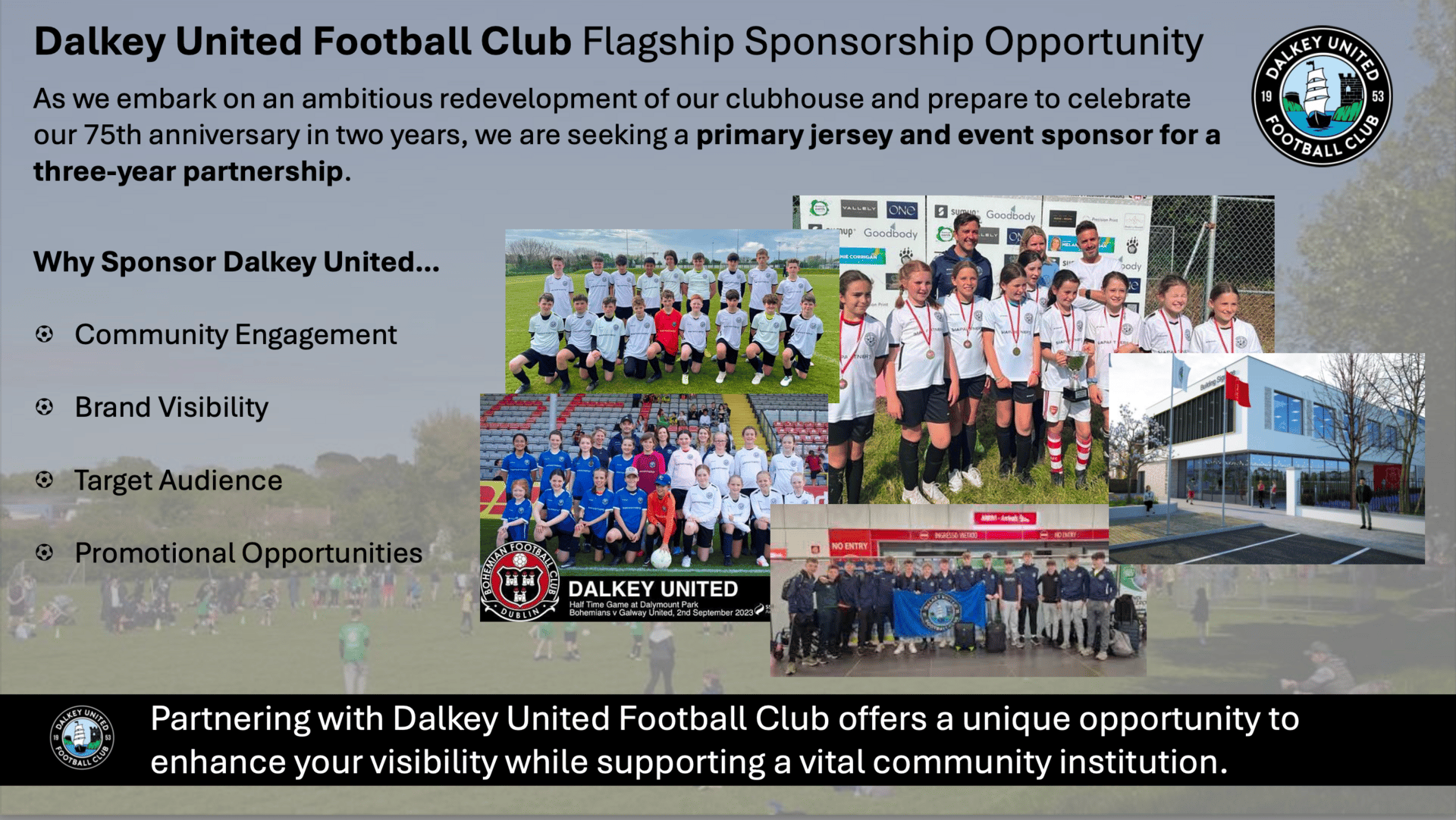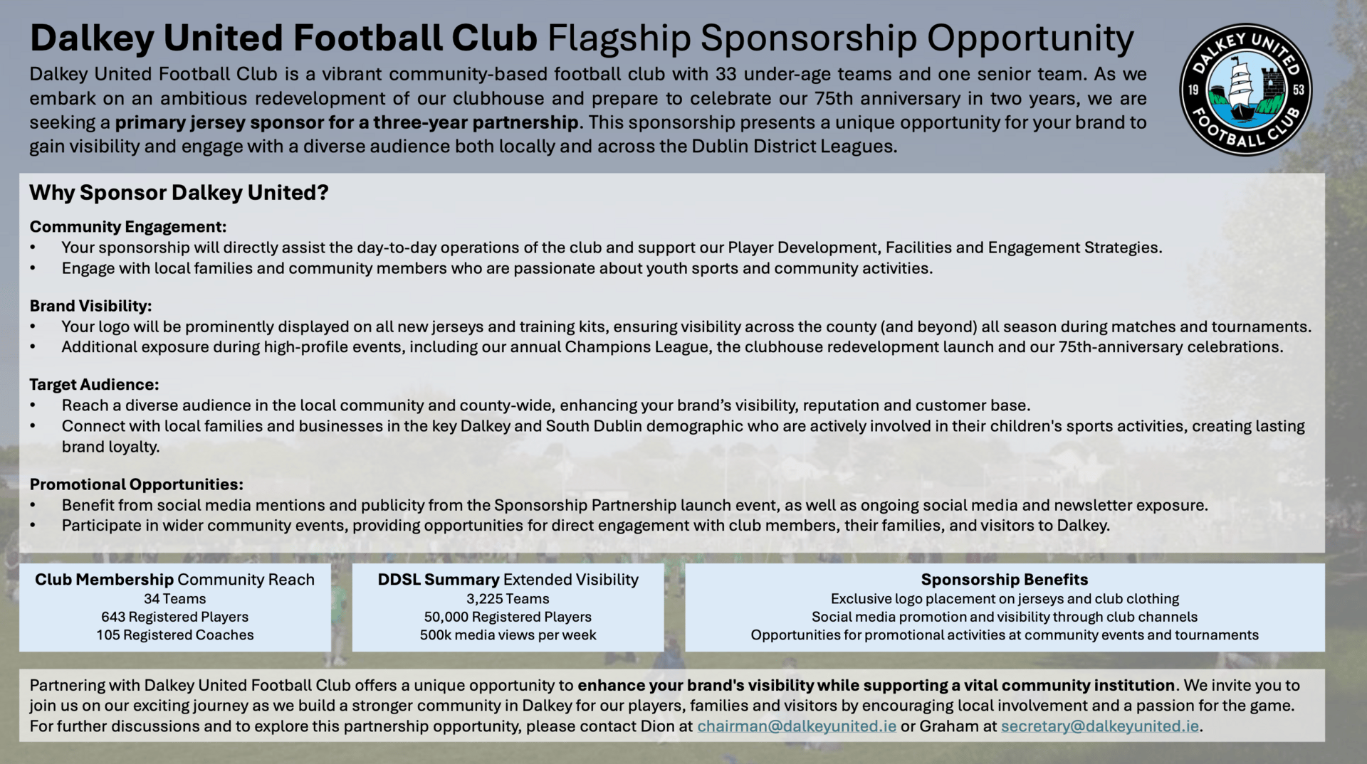Additional (sharable) information is available here: Dalkey United Sponsorship Opportunity.